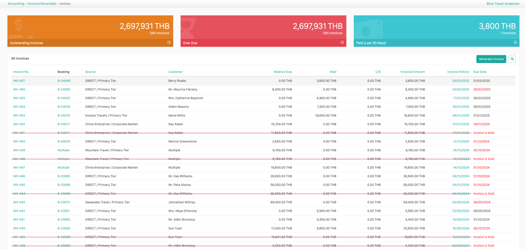 features streamlines accounting by efficiently managing both accounts payable (AP) and accounts receivable (AR). It automates invoicing, tracking payments, and generating financial reports, reducing manual effort and errors. The system allows operators to track outstanding payments, manage vendor bills, and set payment reminders, ensuring timely settlements. Integration with booking and payment systems ensures accurate financial data, while customizable reporting features offer insights into cash flow, revenue, and expenses.
