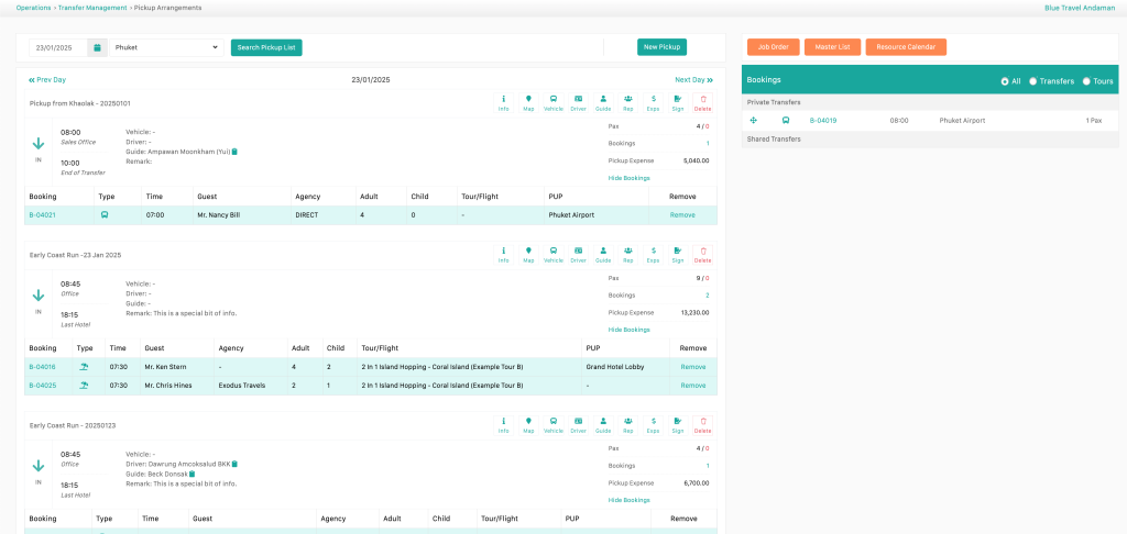 features ensures seamless coordination of resources and guest services. Guide orders can be issued for tour guides, while job orders are generated for other resources, ensuring clear task assignments. Guest and booking details are integrated into the workflow for efficient scheduling. Airport pickup signs can be generated for easy guest identification. Pickup arrangements can be optimized across multiple bookings, allowing vehicles and resources to be allocated efficiently. This system enhances operational efficiency, reduces scheduling conflicts, and ensures a smooth guest experience.