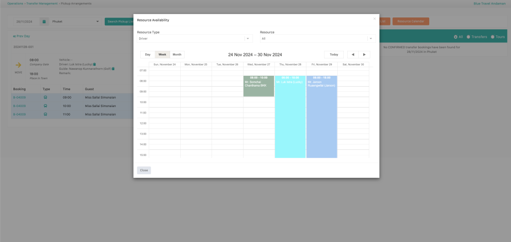 features include a centralized calendar for availability tracking, ensuring efficient allocation of human and vehicle resources. The system manages personnel such as drivers, tour guides, and sales representatives, along with vehicles, to streamline operations. It enables real-time tracking of available dates and times for bookings, including pickups, ensuring optimal resource utilization. By integrating scheduling and resource allocation, businesses can prevent overbooking, improve service efficiency, and maintain smooth daily operations.